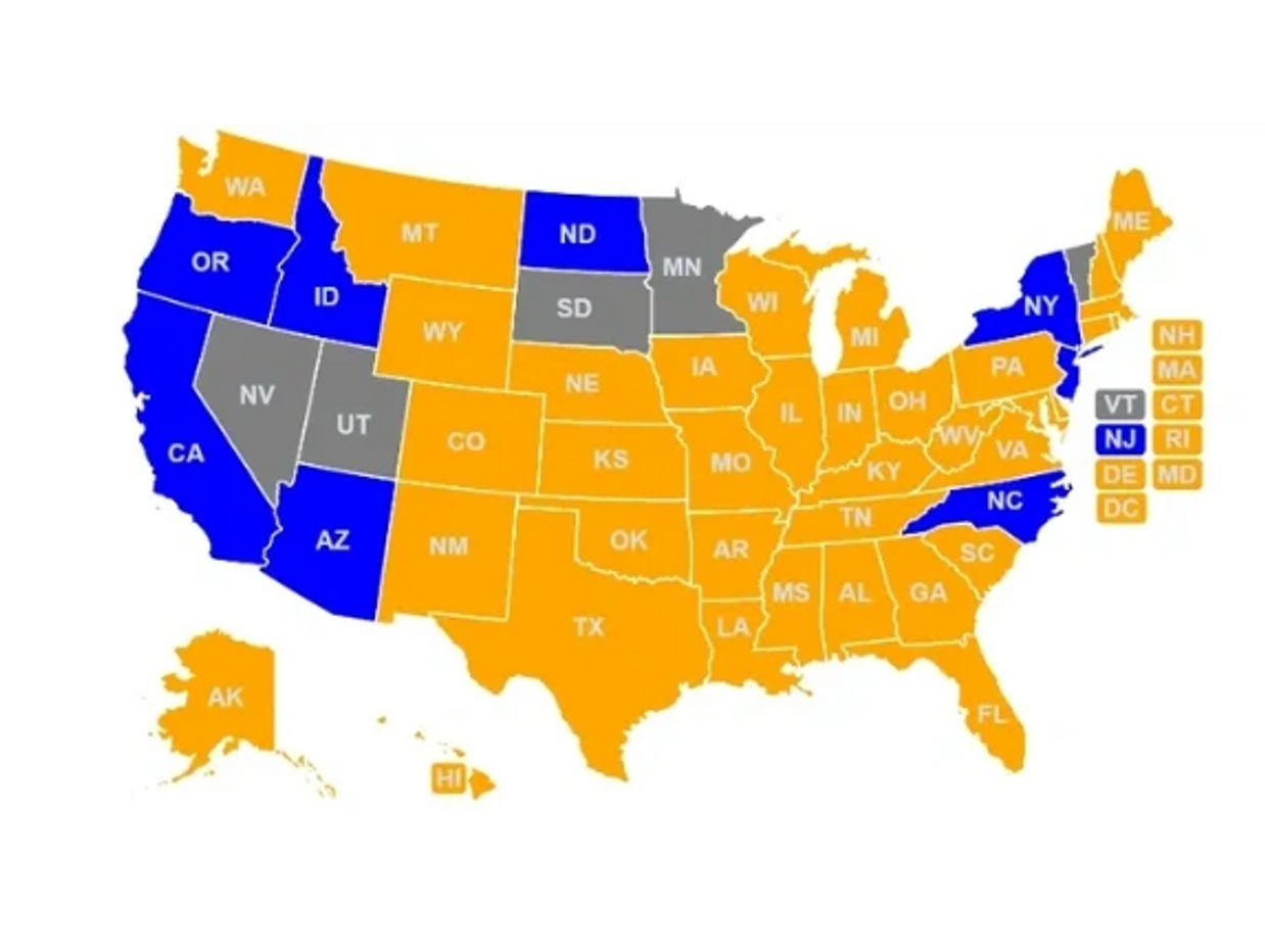 ⟶ New York, New Jersey, North Carolina, North Dakota, Idaho, Oregon, California, Arizona